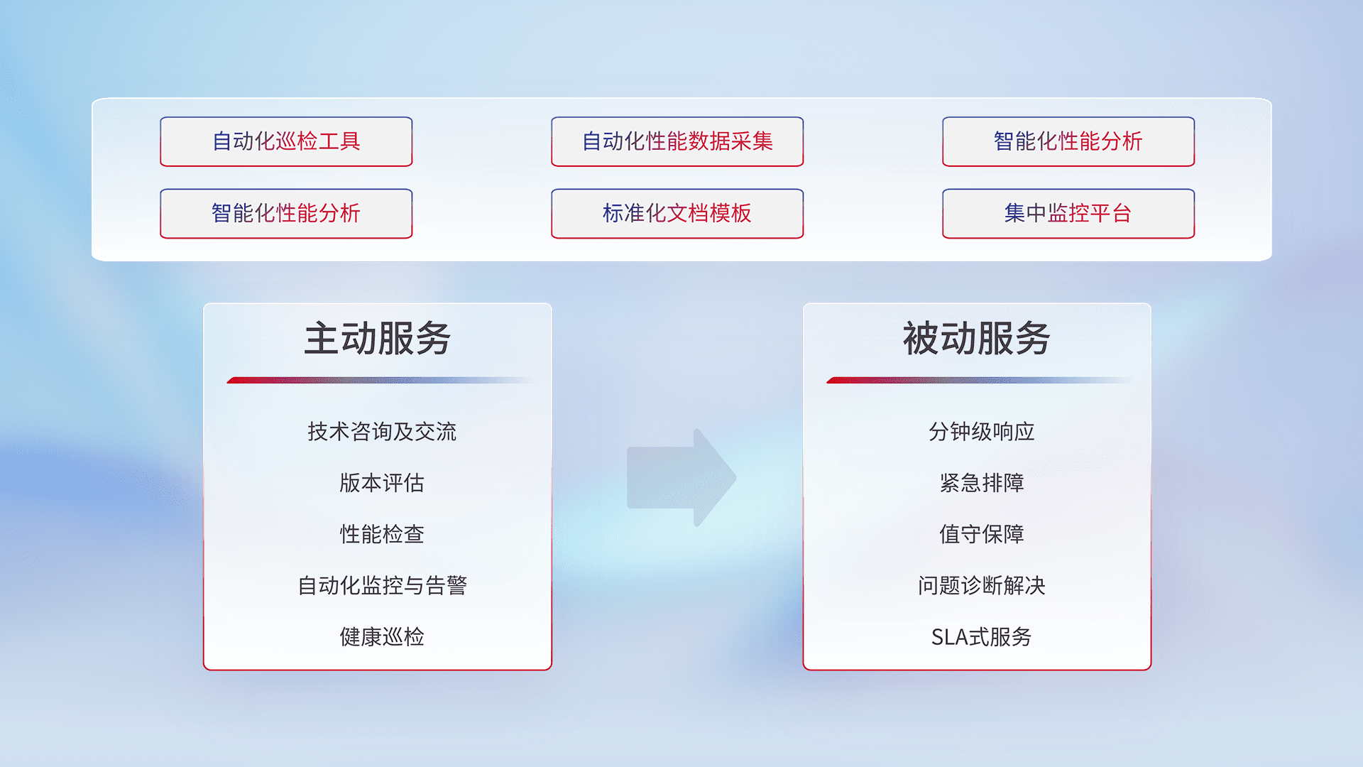智能化工具和标准化文档,,,,保障服务质量,,提供主动服务(包含技术咨询、、、版本评估、、、、性能检查、、、自动化监控与告警、、健康巡检)和被动服务包含(分钟级响应、、紧急排障、、、、值守保障、、、问题诊断解决、、SLA服务)。。