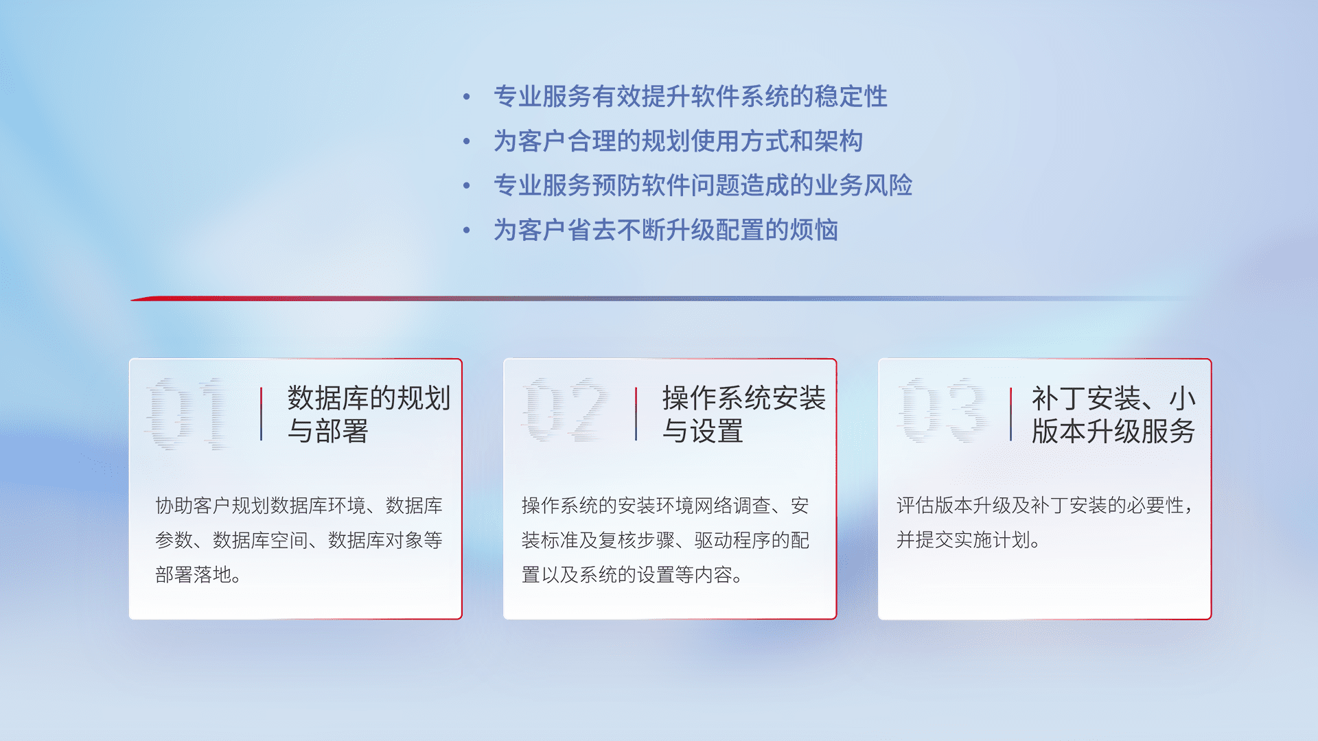 为客户提供软件规模升级、、、快速部署、、按需配置的专业服务,,从数据库的规划与部署到操作系统的安装与设置,,,再到补丁安装和小版本升级提供支持。。。。