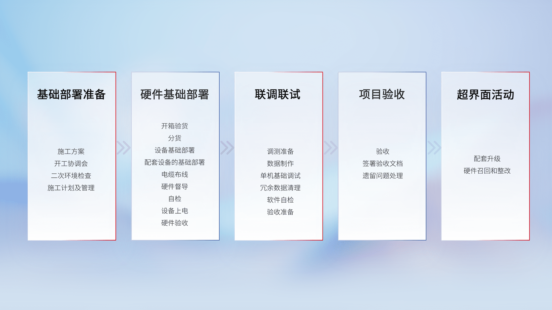 从基础部署准备、、、、硬件基础部署、、联调联试、、、项目验收、、、、越界面活动的全过程可追溯,,保证施工质量和进度。。。。